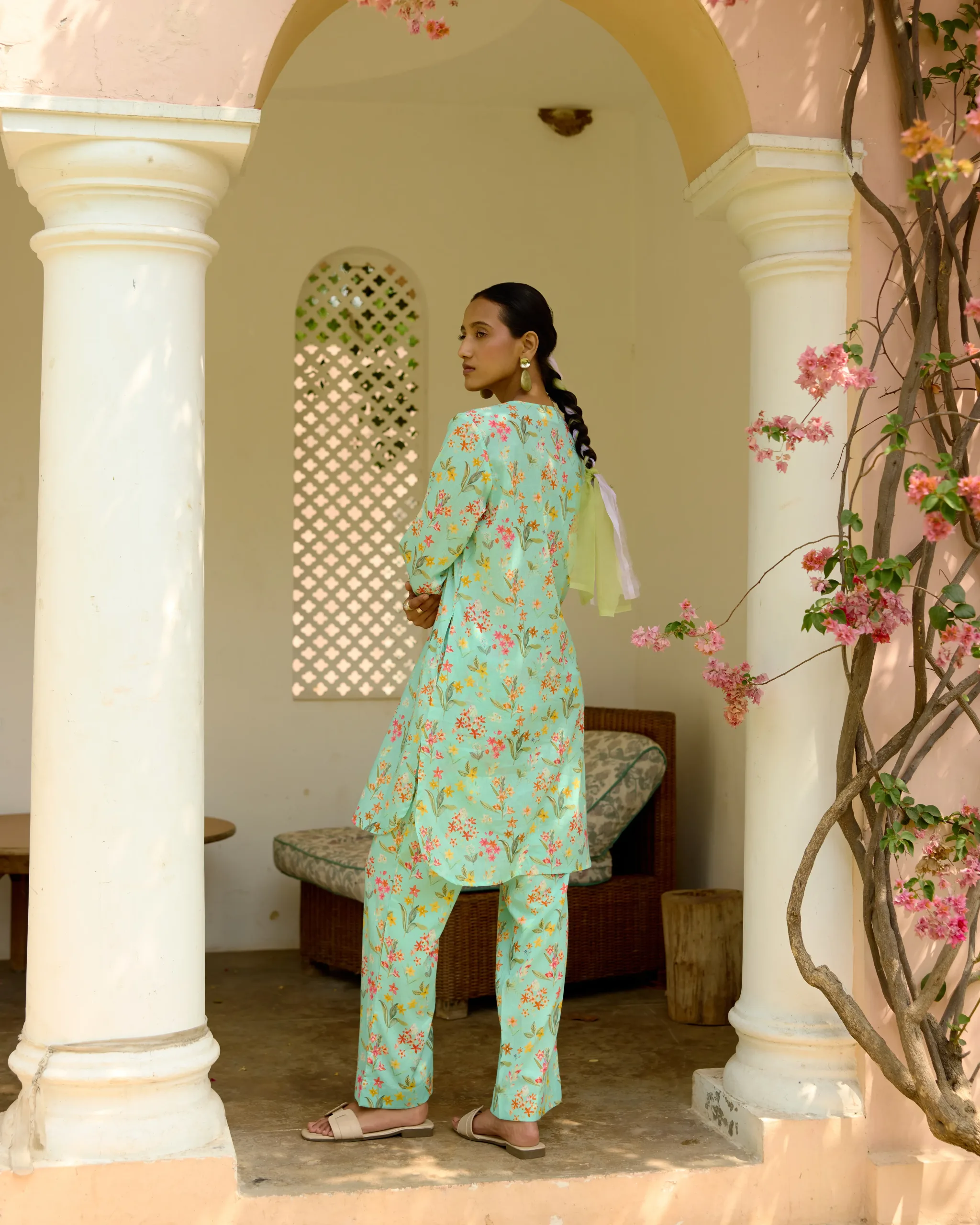 Gracefully tailored and consciously crafted, the Clara Coord Set is a celebration of refined comfort and effortless elegance. Made from 100% breathable cotton, this two-piece set features a straight-cut kurta with subtle side slits and digitally rendered florals – adapted from original hand-drawn artwork. The serene aqua base is brought to life with delicate blossoms in soft coral, mustard, and ivory tones, creating a look that’s both fresh and timeless.