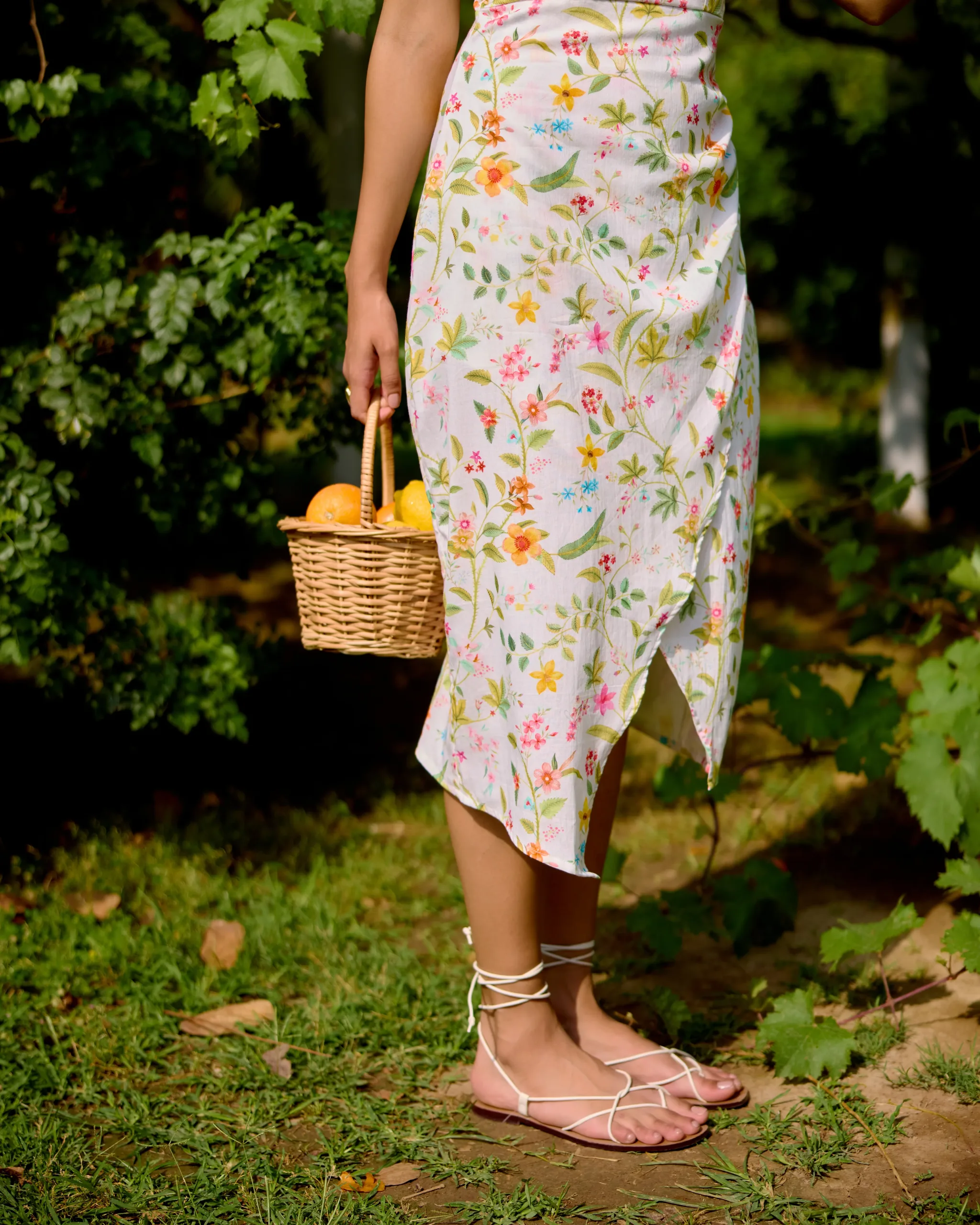 Crafted from 100% cotton, this Gardenia dress is a harmonious blend of sustainability and elevated elegance. The hand-drawn floral motifs are thoughtfully transformed into a digital print using low CO₂ emission technology, ensuring a lighter footprint on the planet.