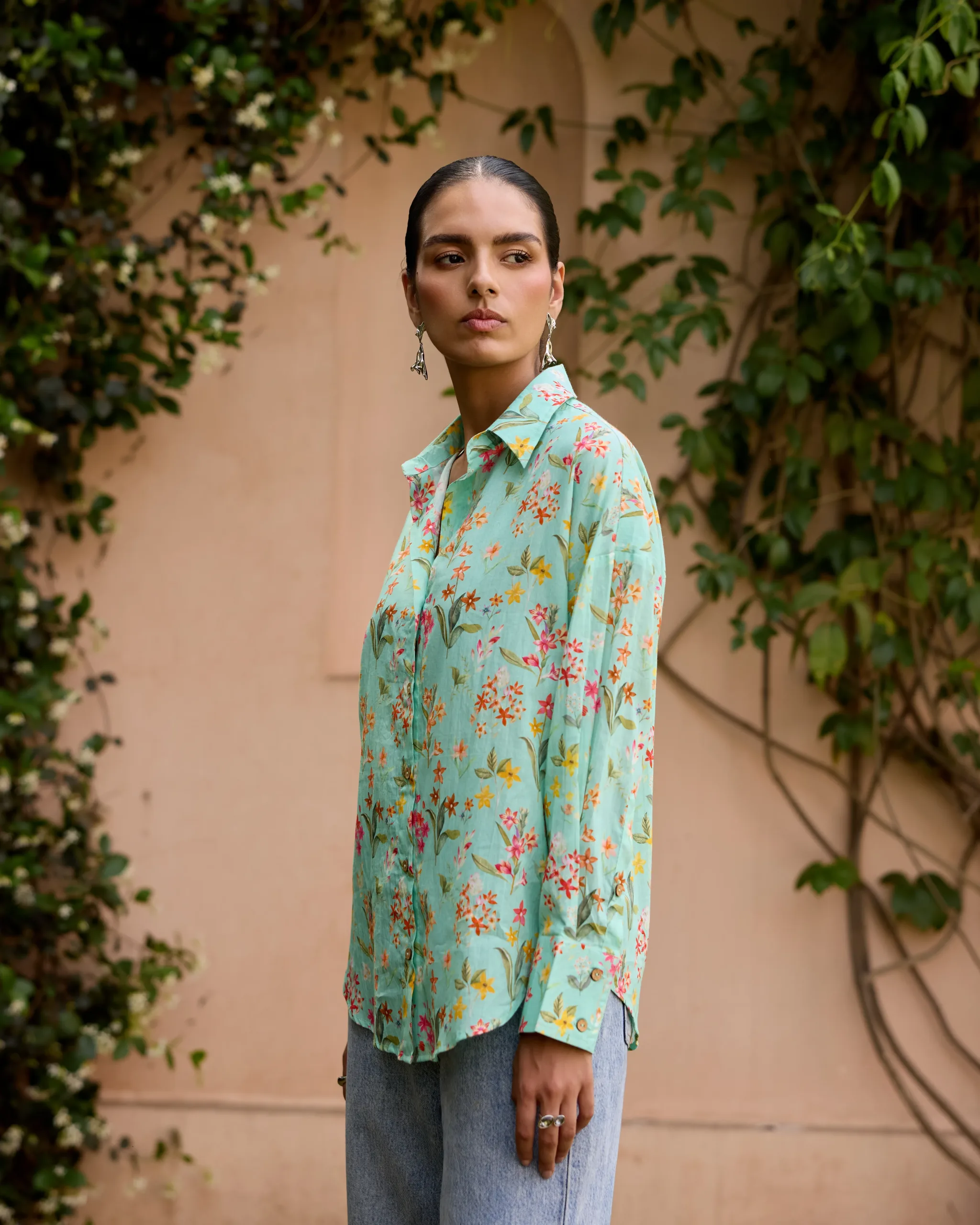 The Taylor Shirt in Green is a breezy, botanical-inspired staple crafted in soft, breathable pure cotton. Showcasing a digitally rendered floral print originally sketched by hand, this piece combines artisanal charm with low-impact technology.
